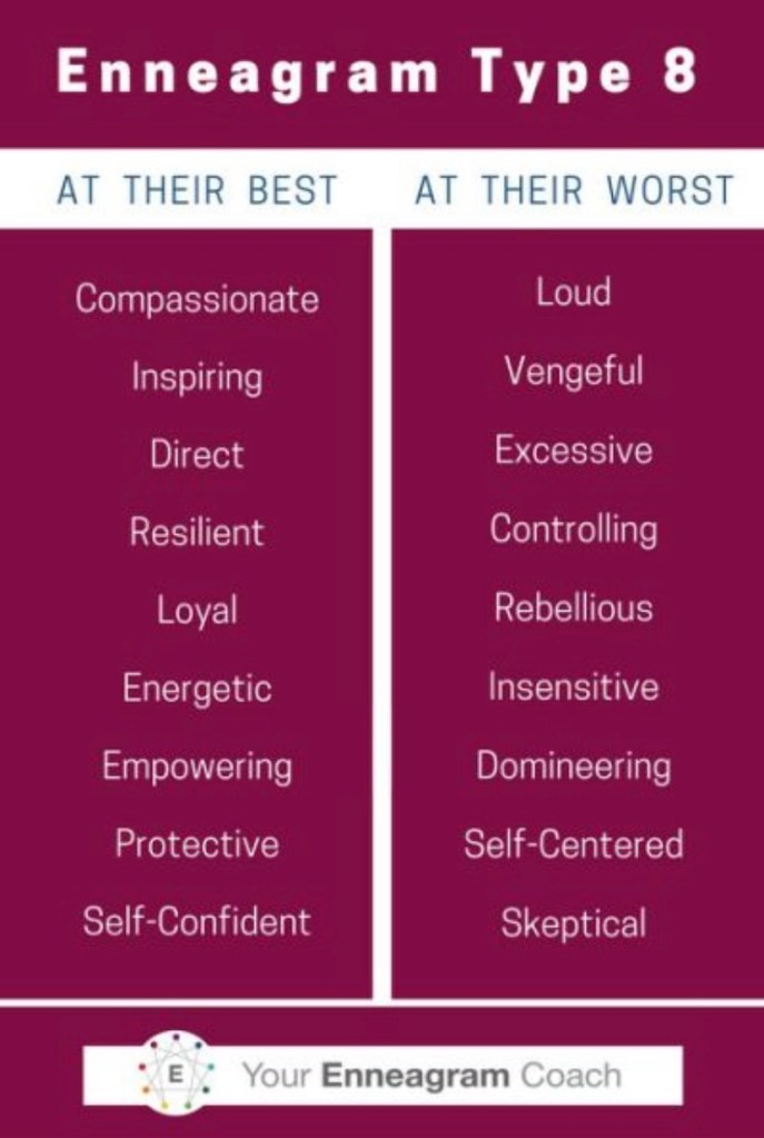 My results came back and suggested that I was an 8, the challenger. That sounded interesting to me since I do enjoy challenging the status quo as well as challenging myself. I clicked the link to learn more. On the description page I was told that an 8 is self-confident, decisive, willful, and confrontational. That still sounded like me, so I read on. As I continued on with the more in depth description, it was impressively accurate. It talked about how the basic fear of an 8 is being controlled by someone else, how people with this personality are fiercely independent but also look to be protective to those closest to them. At the bottom it showed examples of what this personality type looks like at healthy levels, at average levels, and at unhealthy levels. Fascinating. I could see various parts of myself in several different levels. Then underneath of that, was a compatibility chart explaining how an 8 gets along with the other personality types in the Enneagram. This would become more interesting once I learned the types of my husband and kids, my coworkers and my friends.